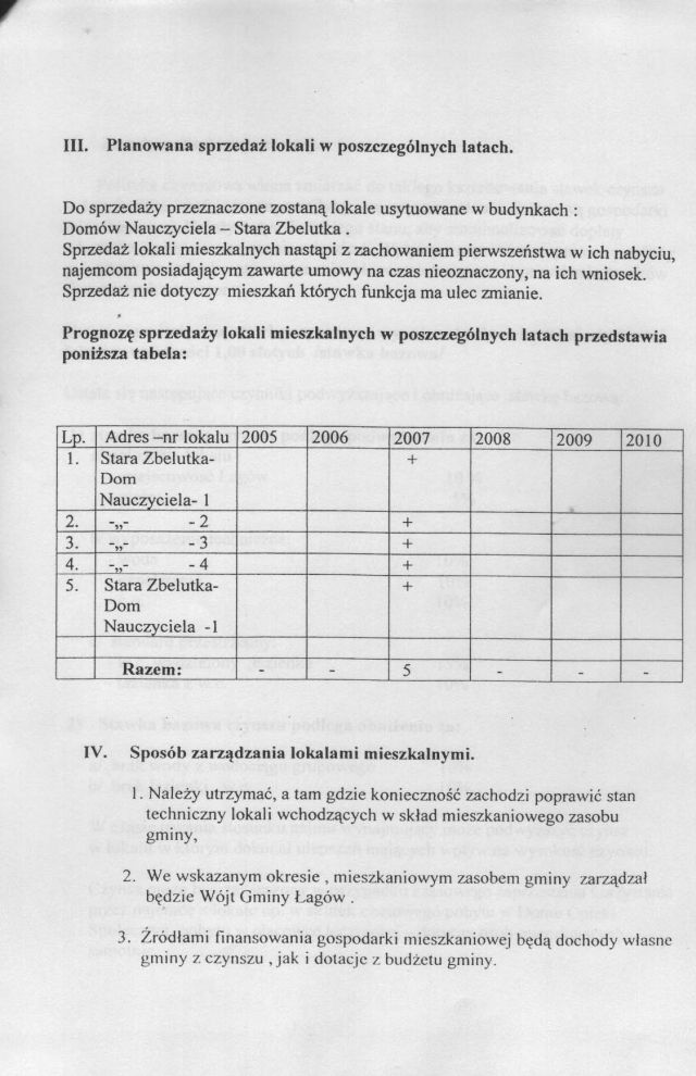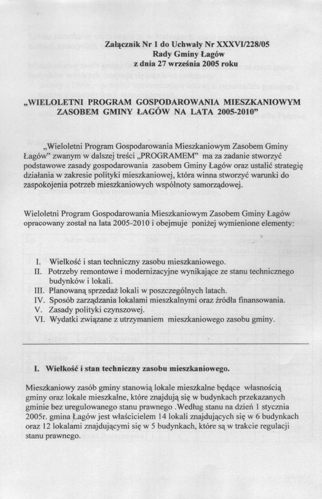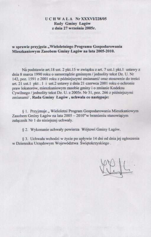 | Uchwała nr XXXVI/228/05 Rady Gminy w Łagowie z dn. 27 września 2005 r. w sprawie przyjęcia "Wieloletniego Programu Gospodarowania Mieszkaniowym Zasobem Gminy Łagów na lata 2005 - 2010". | 2008-10-17 |