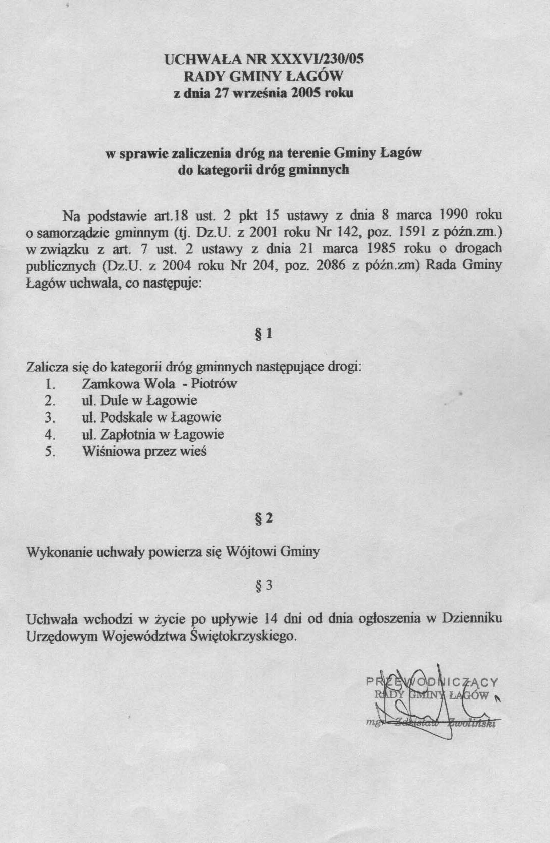 | Uchwała nr XXXVI/230/05 Rady Gminy w Łagowie z dn. 2005 r. w sprawie zaliczenia dróg na terenie Gminy Łagów do kategorii dróg gminnych. | 2008-10-17 |