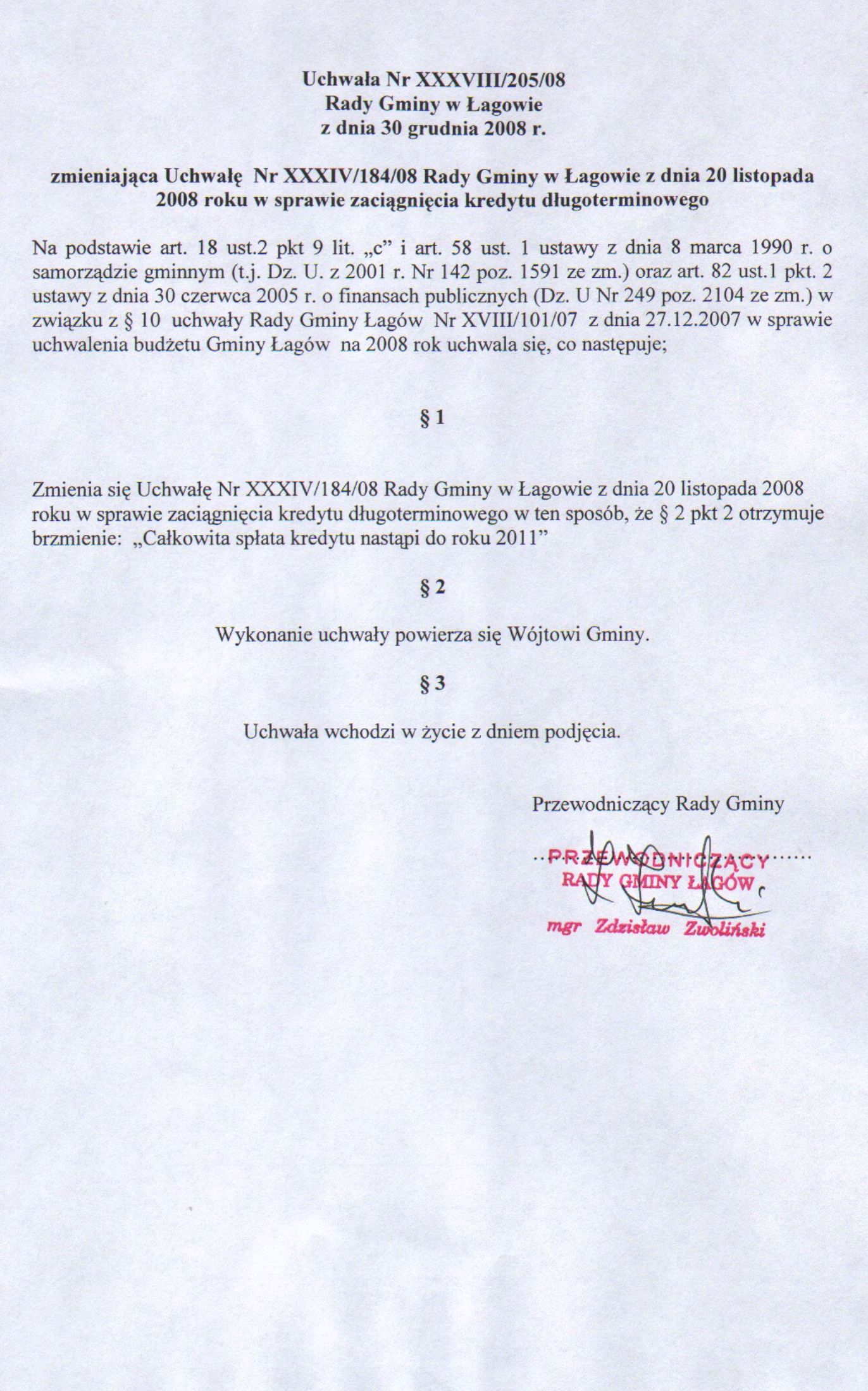 | Uchwała Nr XXXVIII/205/08 Rady Gminy w Łagowie z dn. 30 grudnia 2008 zmieniająca Uchwałę Nr XXXIV/184/08 Rady Gminy w Łagowie z dn. 20 listopada 2008 roku w sprawie zaciągnięcia kredytu długoterminowego. | 2009-01-08 |
