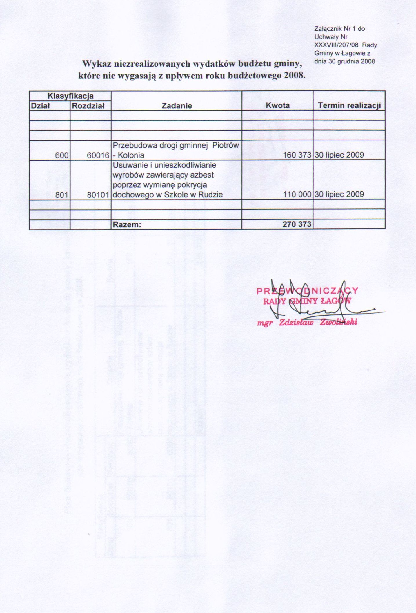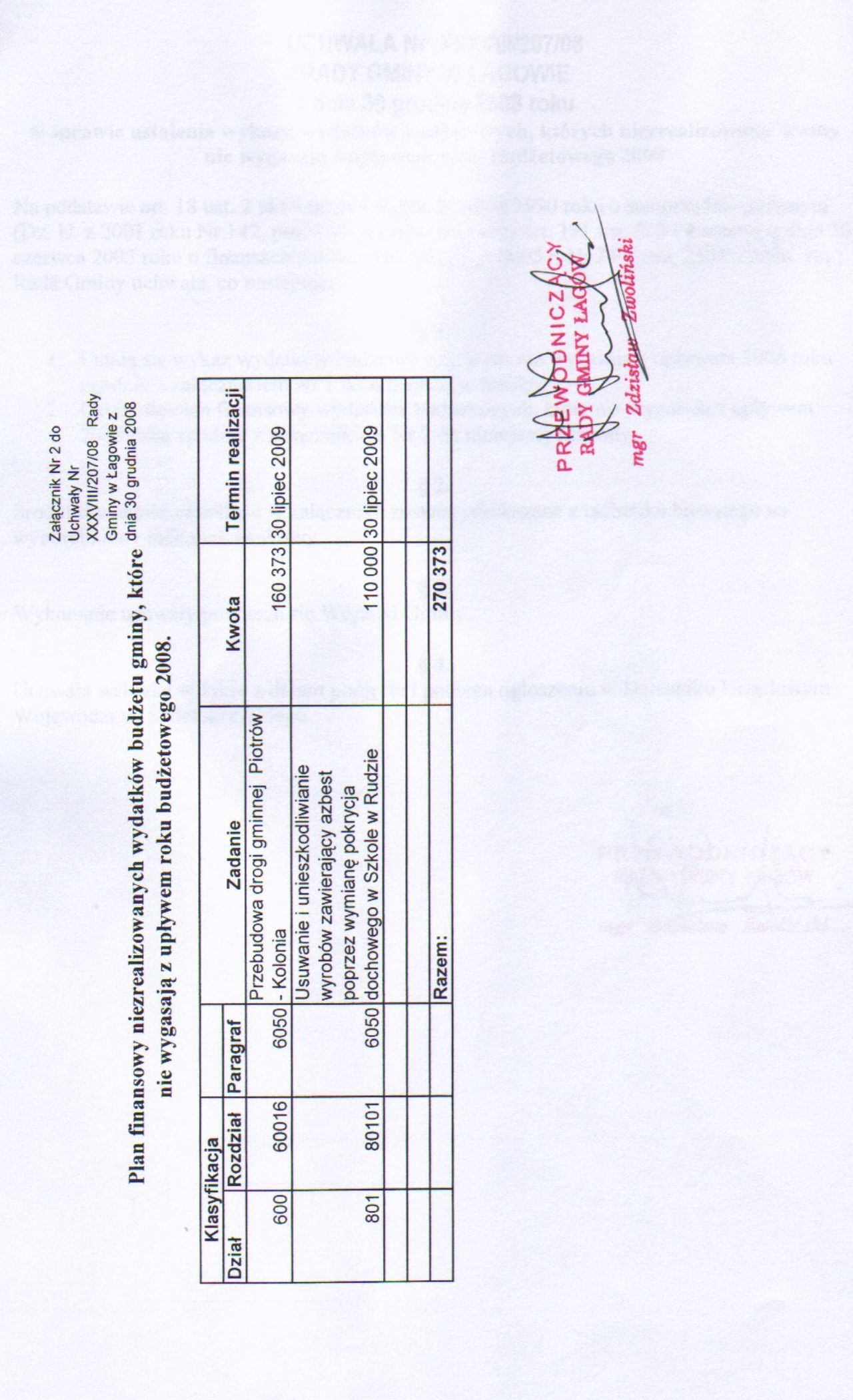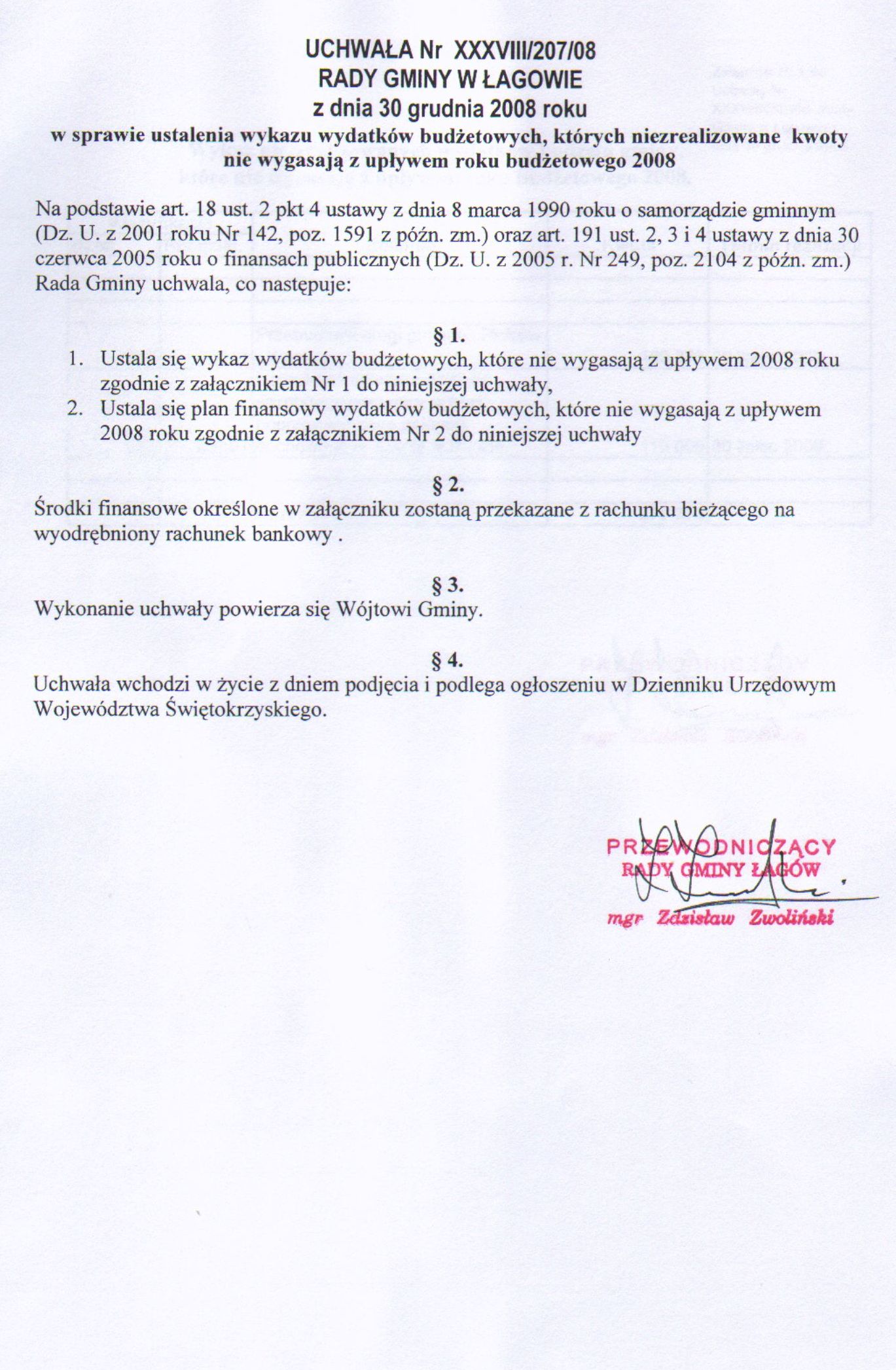| Uchwała Nr XXXVIII/207/08 Rady Gminy w Łagowie z dn. 30 grudnia 2008 w sprawie ustalenia wykazu wydatków budżetowych, których niezrealizowane kwoty nie wygasają z upływem roku budżetowego 2008. | 2009-01-08 |