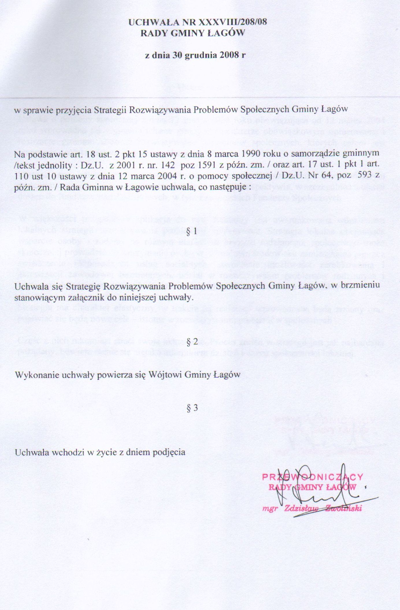 | Uchwała Nr XXXVIII/208/08 Rady Gminy w Łagowie z dn. 30 grudnia 2008 w sprawie przyjęcia Strategii Rozwiązywania Problemów Społecznych w Łagowie. | 2009-01-08 |
