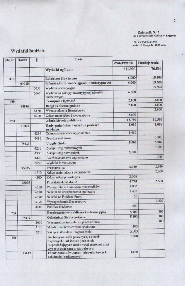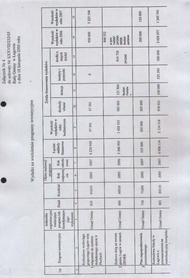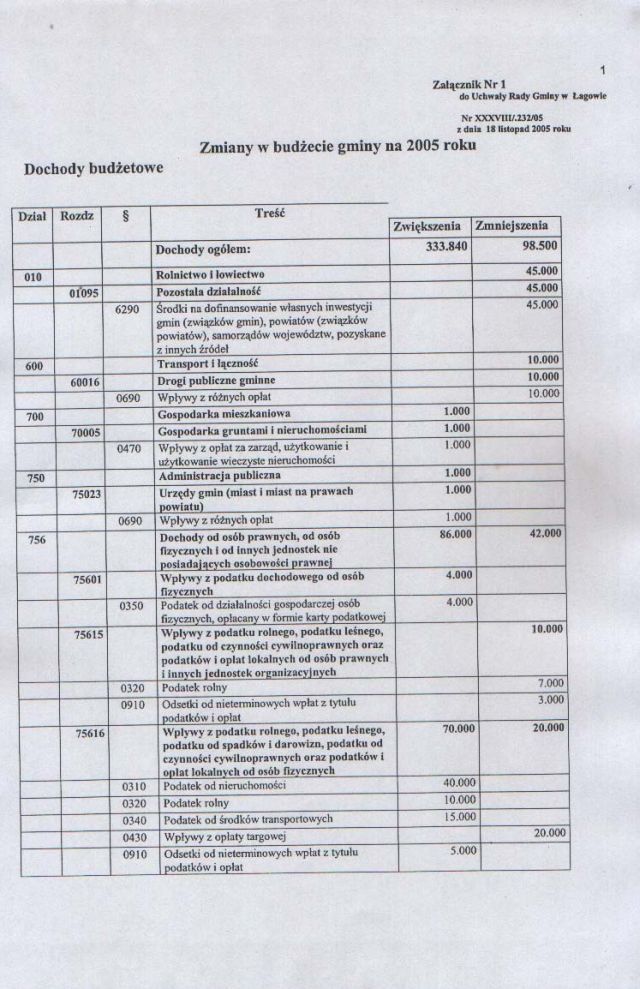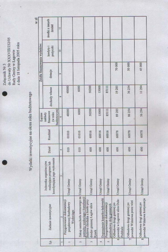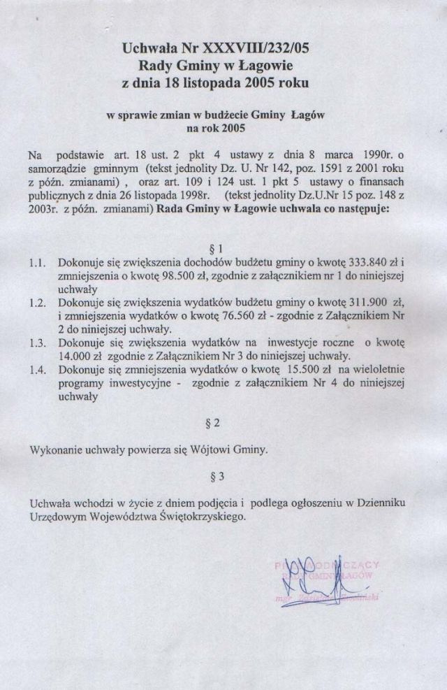 | Uchwała nr XXXVIII/232/05 Rady Gminy w Łagowie z dn. 18 listopada 2005 r. w sprawie zmian w budżecie Gminy Łagów na rok 2005. | 2008-10-22 |