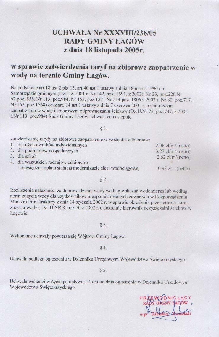 | Uchwała nr XXXVIII/236/05 Rady Gminy w Łagowie z dn. 18 listopada 2005 r. w sprawie zatwierdzenia taryfy na zbiorowe zaopatrzenie w wodę na terenie Gminy Łagów. | 2008-10-22 |