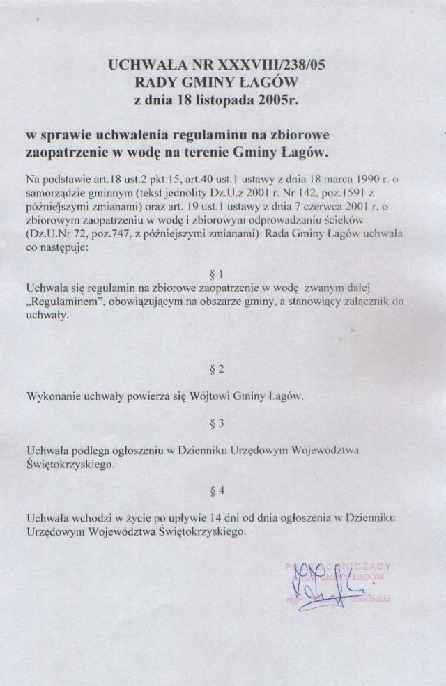| Uchwała nr XXXVIII/238/05 Rady Gminy w Łagowie z dn. 18 listopada 2005 r. w sprawie uchwalenia regulaminu na zbiorowe zaopatrzenie w wodę na terenie Gminy Łagów | 2008-10-22 |