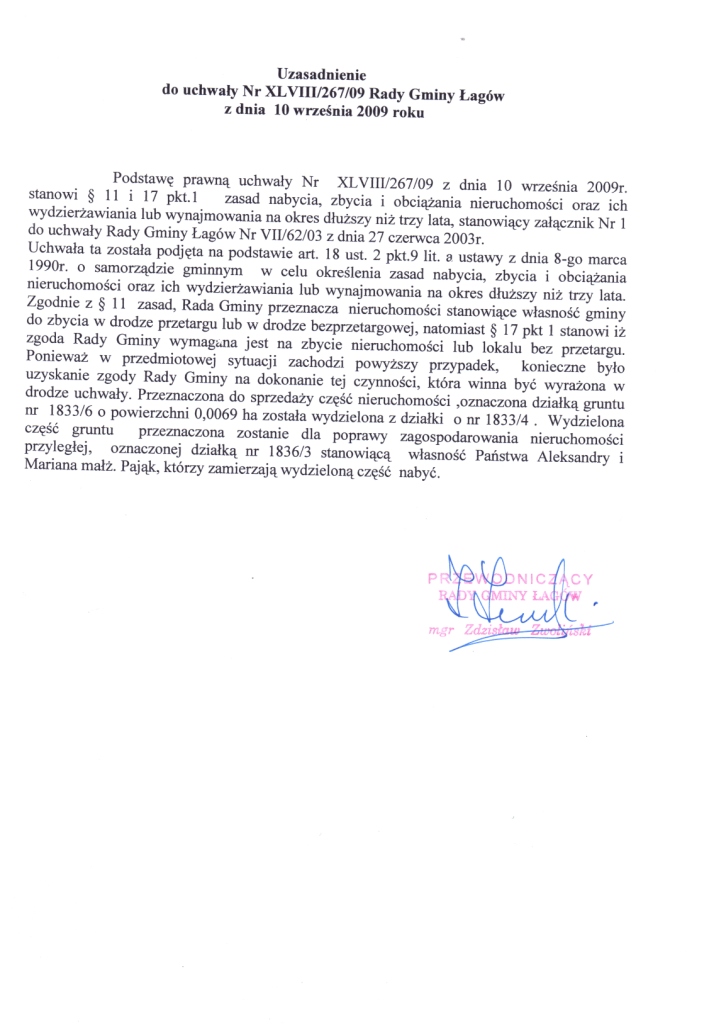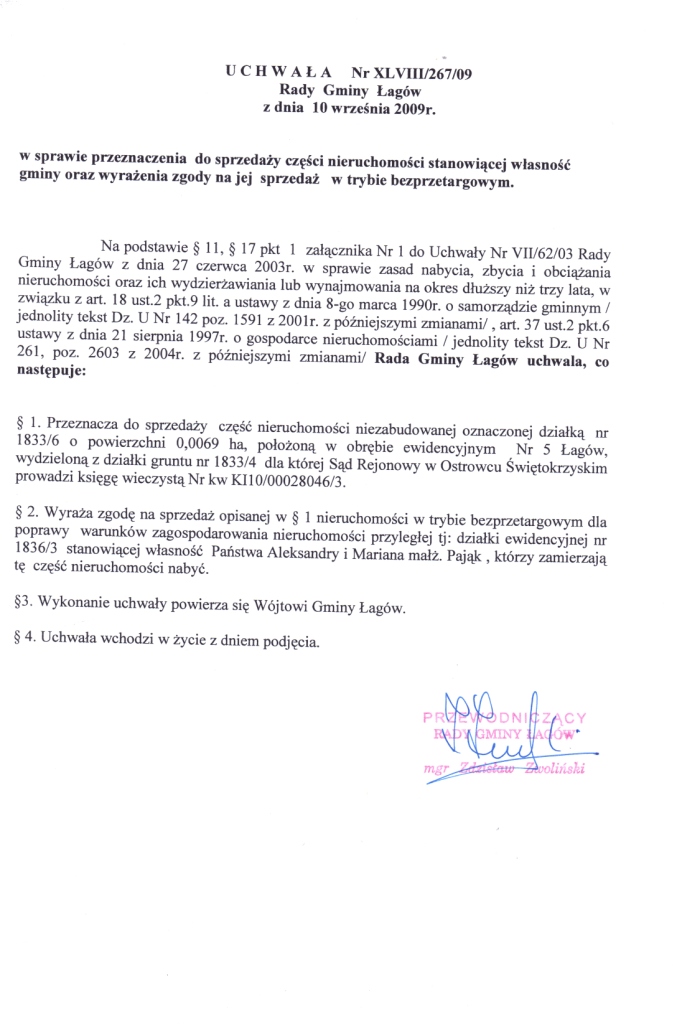 | Uchwała XLVIII/267/09 Rady Gminy Łagów z dnia 10 września 2009r. w sprawie przeznaczenia do sprzedaży części nieruchomości stanowiacej własność gminy oraz wyrażenia zgody na jej sprzedaż w trybie bezprzetargowym. | 2009-09-18 |