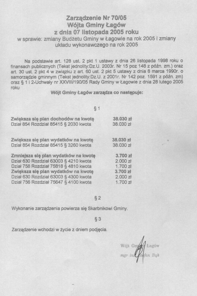 | Zaqrządzenie nr 70/05 Wójta Gminy Łagów z dn. 7 listopada 2005 r. w sprawie zmiany Budżetu Gminy w Łagowie na rok 2005 i zmiany układu wykonawczwego na rok 2005. | 2008-10-17 |