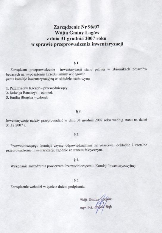 | Zarzadzanie nr 96/07 Wójta Gminy Łagów z dn 31 grudnia 2007 r. w sprawie przeprowadzenia inwętaryzacji | 2008-09-29 |