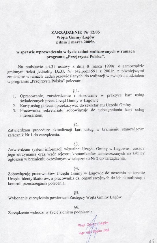 | Zarządzenia nr 12/05 Wójta Gminy Łagów z dn. 1 marca 2005 r. w sprawie wprowadzenia w życie zadań realizowanych w ramach programu „Przejrzysta Polska”. | 2008-10-17 |