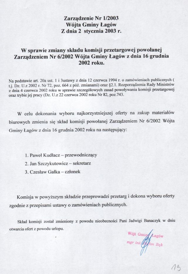 | Zarządzenie nr 1/03 Wójta Gminy Łagów z dn. 2 stycznia 2003 r. w sprawie powołania komisji przetargowej powołanej Zarządzeniem Nr 6/2002 Wójta Gminy Łagów z dn. 16 grudnia 2002 roku. | 2008-10-23 |