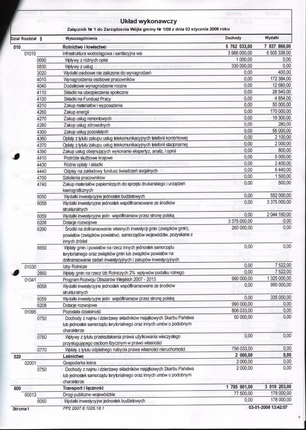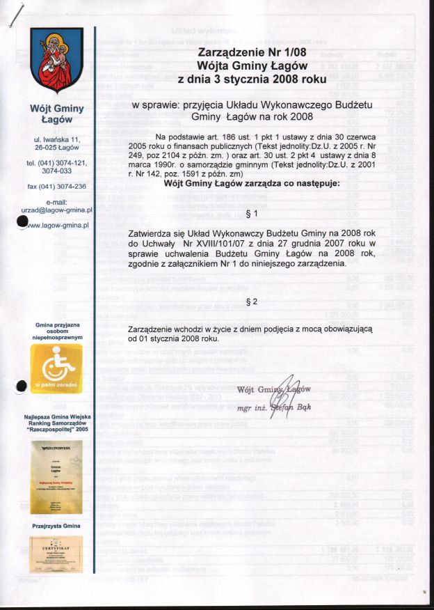| Zarządzenie nr 1/08 Wójta Gminy Łagów z dn. 3 stycznia 2008 r. w sprawie przyjęcia Układu Wykonawczego Budżetu Gminy Łagów na rok 2008. | 2008-08-23 |