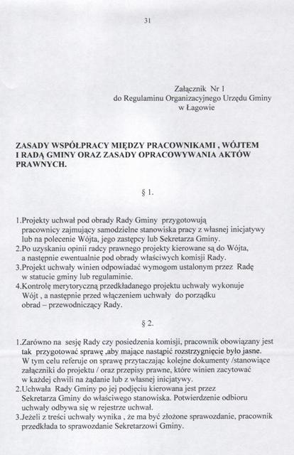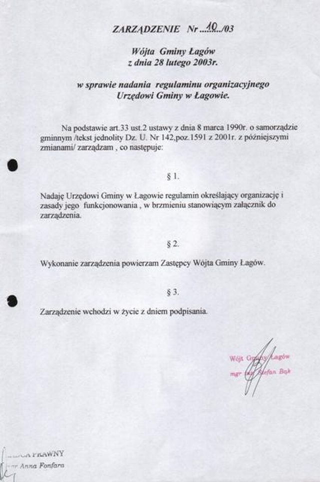 | Zarządzenie nr 10/03 Wójta Gminy Łagów z dn. 28 lutego 2003 r. w sprawie nadania regulaminu organizacyjnego Urzędowi Gminy w Łagowie. | 2008-10-23 |
