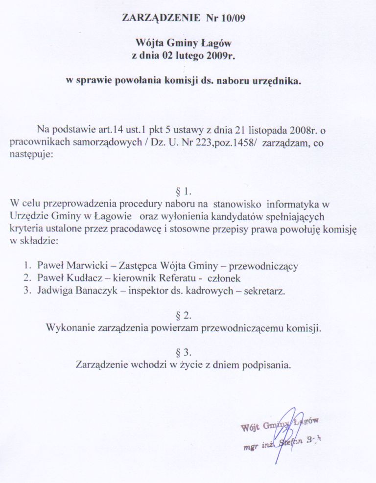 | Zarządzenie nr 10/09 Wójta Gminy Łagów z dnia 2 lutego 2009 r. w sprawie powołania komisji ds. naboru urzędnika | 2009-06-10 |