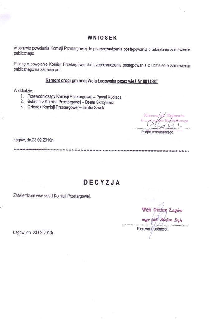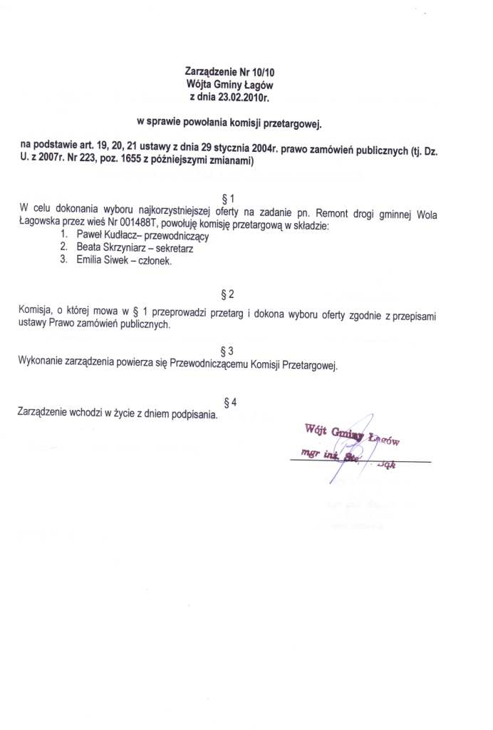 | Zarządzenie Nr 10/10 Wójta Gminy Łagów z dnia 23.02.2010 roku w sprawie powołania komisji przetargowej | 2010-05-14 |