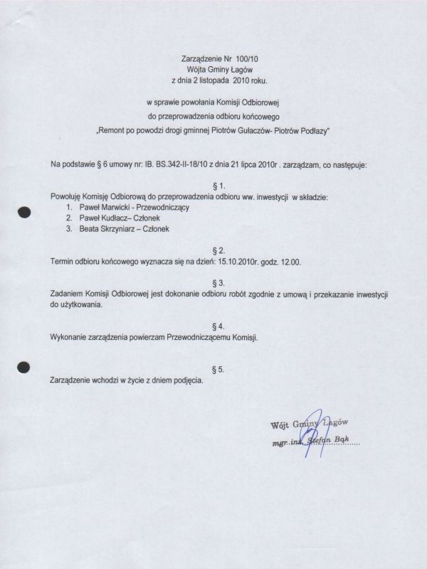 | Zarządzenie Nr 100/10 Wójta Gminy Łagów z dnia 02 listopada 2010 r. w sprawie powołania Komisji Odbiorowej do przeprowadzenia odbioru końcowego "Remont po powodzi drogi gminnej Piotrów Gułaczów - Piotrów Podłazy" | 2011-01-04 |