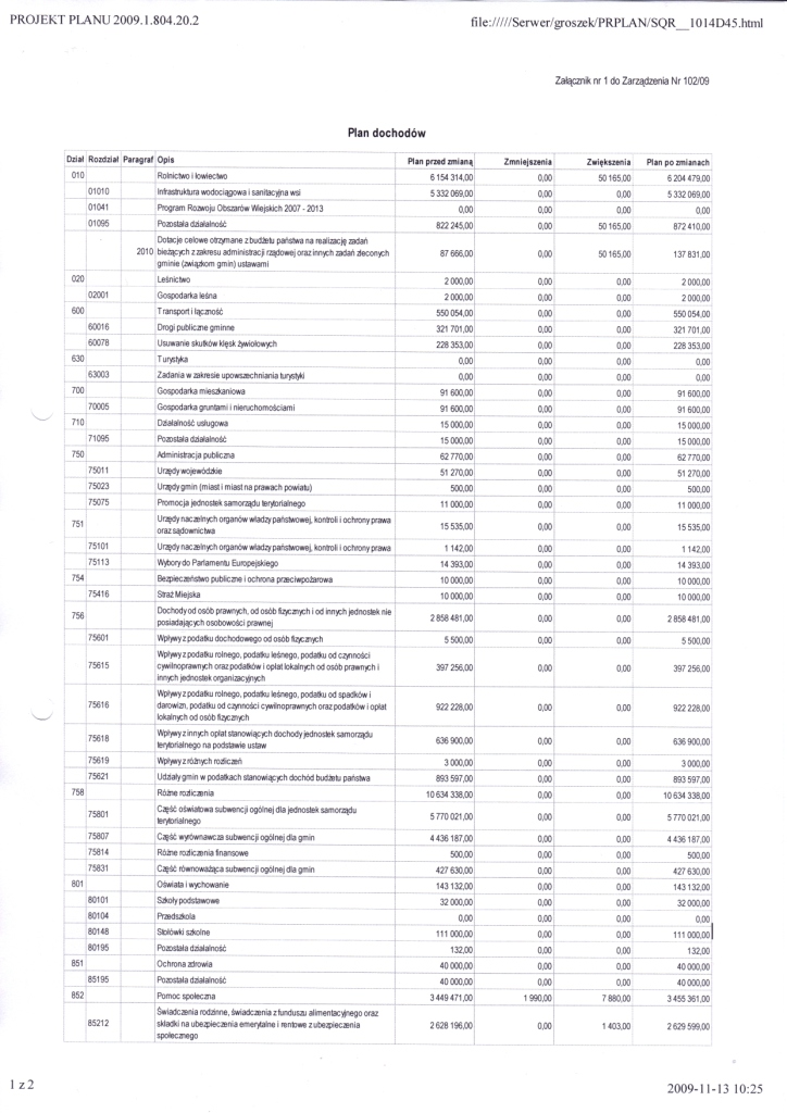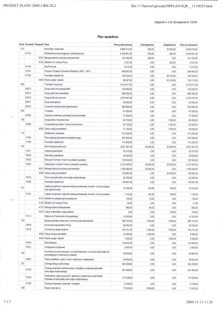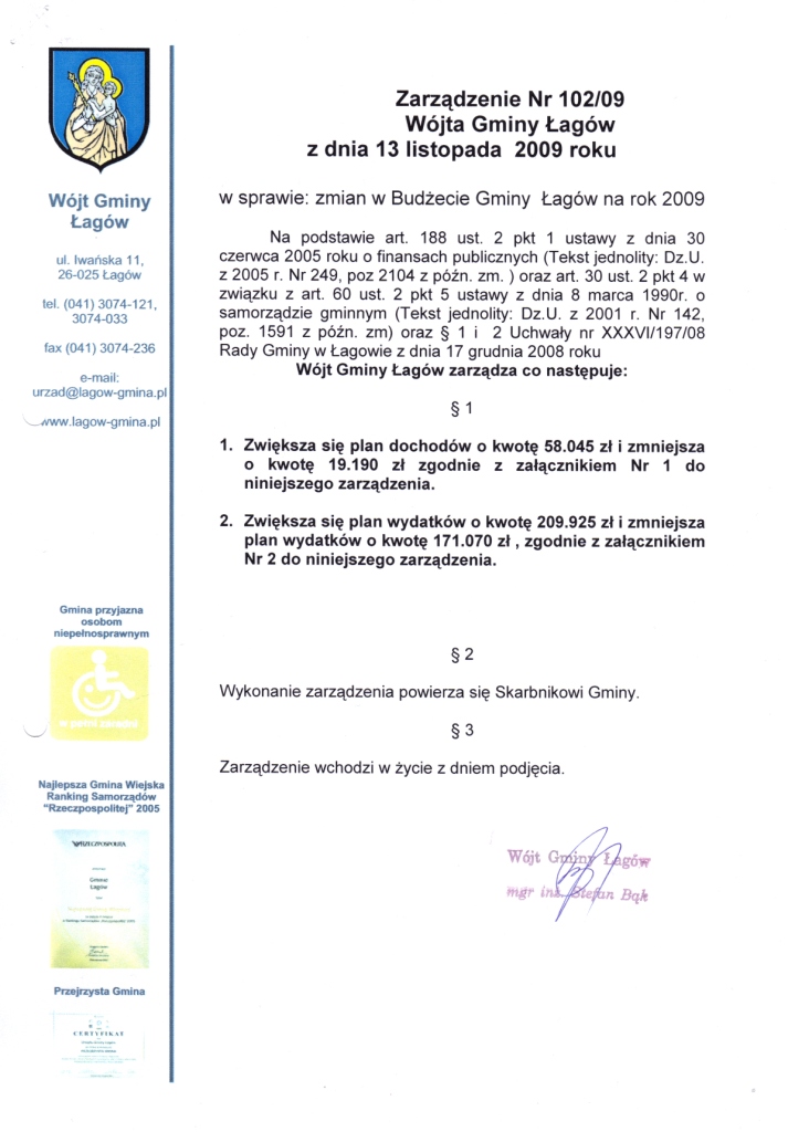 | Zarządzenie Nr 102/09 Wójta Gminy Łagów z dnia 13 listopada 2009r. w sprawie zmian w budżecie Gminy Łagów na 2009r. | 2009-12-24 |
