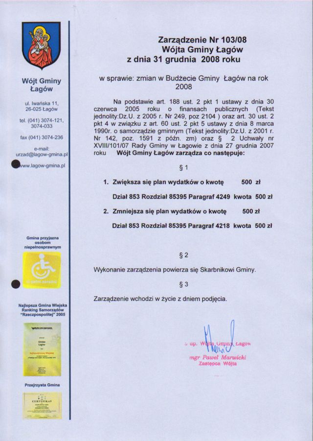 | Zarządzenie Nr 103/08 Wójta Gminy Łagów z dn. 31 grudnia 2008 r. w sprawie zmian w Budżecie Gminy Łagów na rok 2008. | 2009-02-03 |