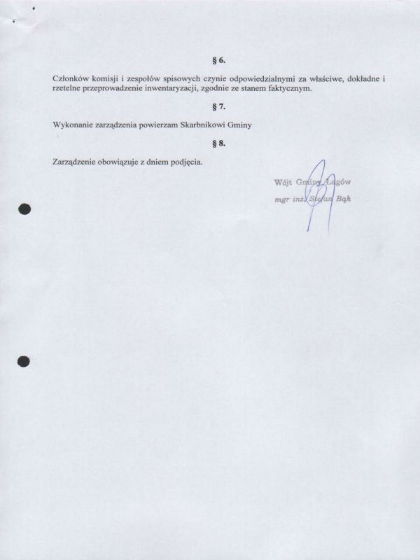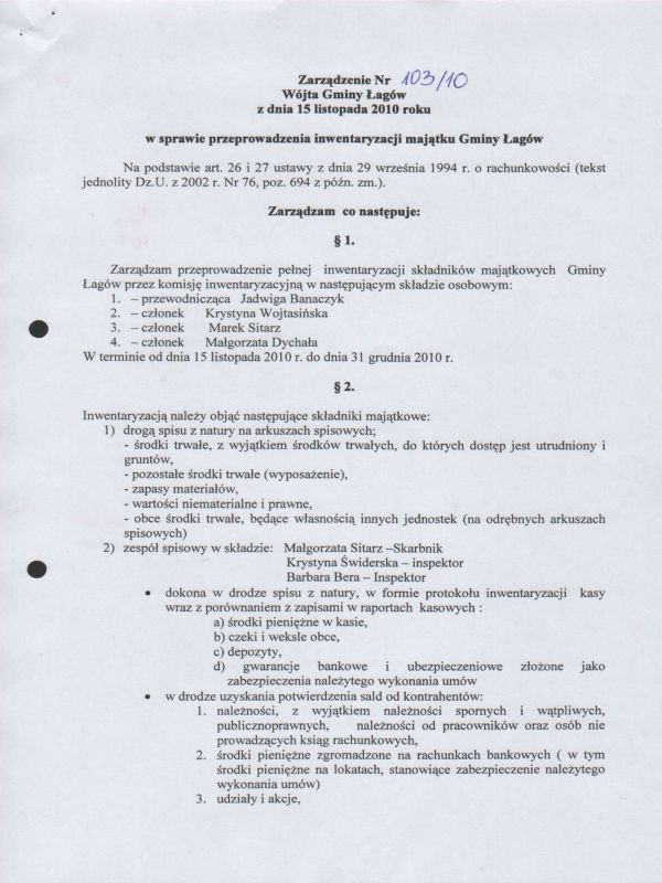 | Zarządzenie Nr 103/10 Wójta Gminy Łagów z dnia 15 listopada 2010 roku w sprawie przeprowadzenia inwentaryzacji majątku Gminy Łagów | 2011-01-04 |