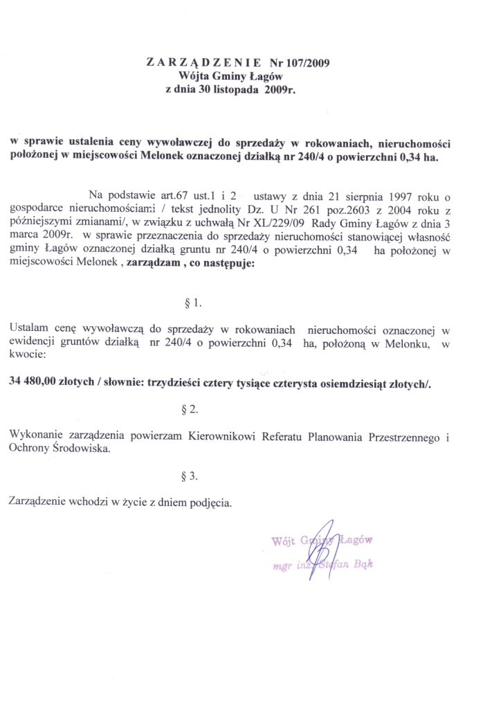 | Zarządzenie Nr 107/09 Wójta Gminy Łagów z dnia 30 listopada 2009r. w sprawie ustalenia ceny wywoławczej do sprzedaży w rokowaniach | 2009-12-24 |
