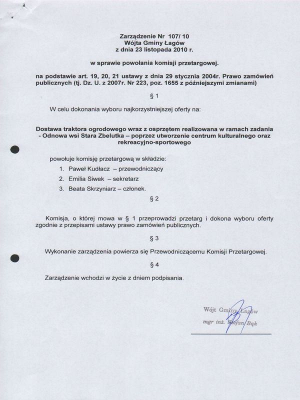 | Zarządzenie Nr 107/10 Wójta Gminy Łagów z dnia 23 listopada 2010 r. w sprawie powołania komisji przetargowej | 2011-01-04 |