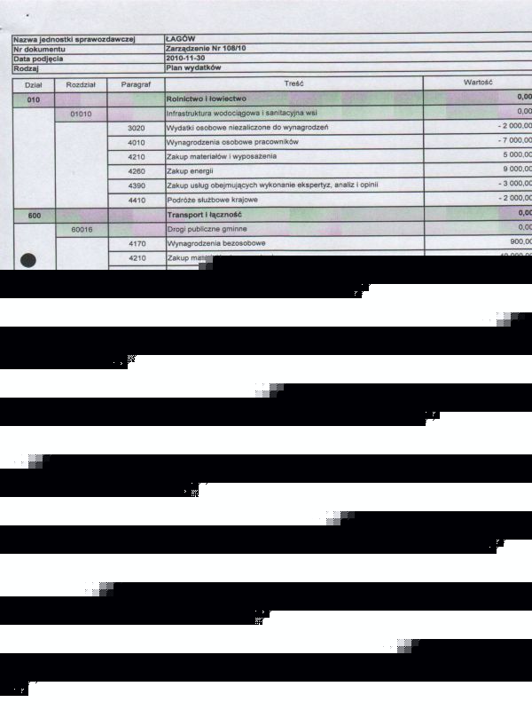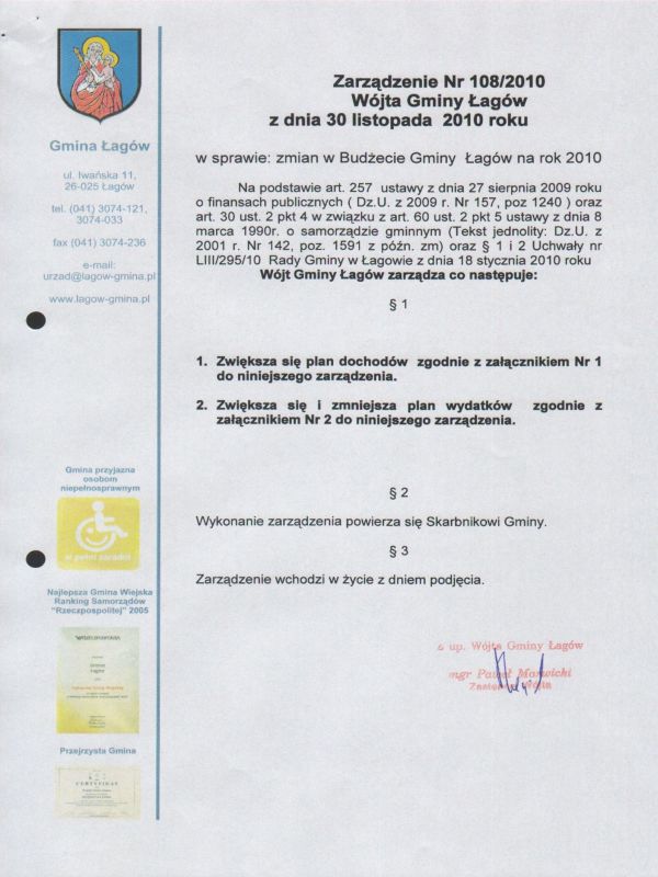 | Zarządzenie Nr 108/2010 Wójta Gminy Łagów z dnia 30 listopada 2010 roku w sprawie: zmian w Budżecie Gminy Łagów na rok 2010 | 2011-01-04 |