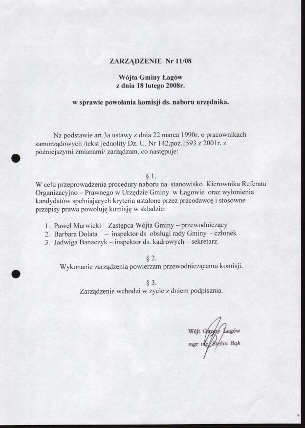 | Zarządzenie nr 11/08 Wójta Gminy Łagów z dn. 18 lutego 2008 r. w sprawie powołania komisji ds. naboru urzędnika. | 2008-08-23 |