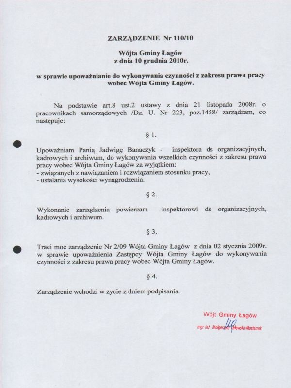 | Zarządzenie Nr 110/10 Wójta Gminy Łagów z dnia 10 grudnia 2010 r. w sprawie upoważnienia do wykonywania czynności z zakresu prawa pracy wobec Wójta Gminy Łagów | 2011-01-04 |