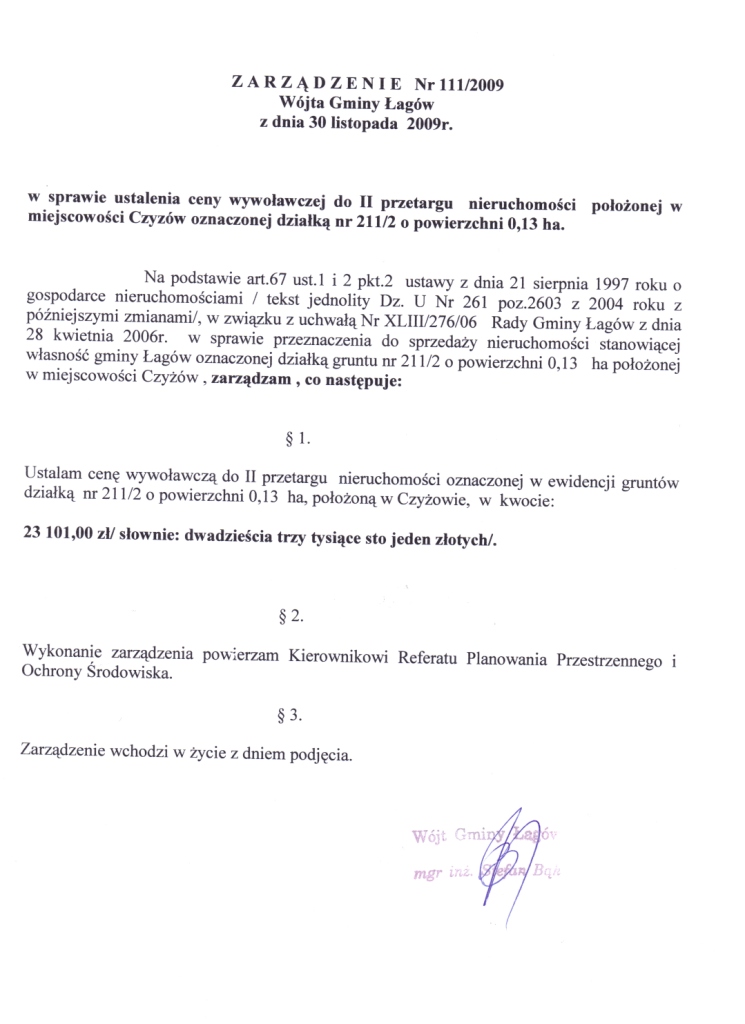 | Zarządzenie Nr 111/09 EWójta Gminy Łagów z dnia 30 listopada 2009r. w sprawie ustalenia ceny wywoławczej do II przet. nieruchomości | 2009-12-24 |