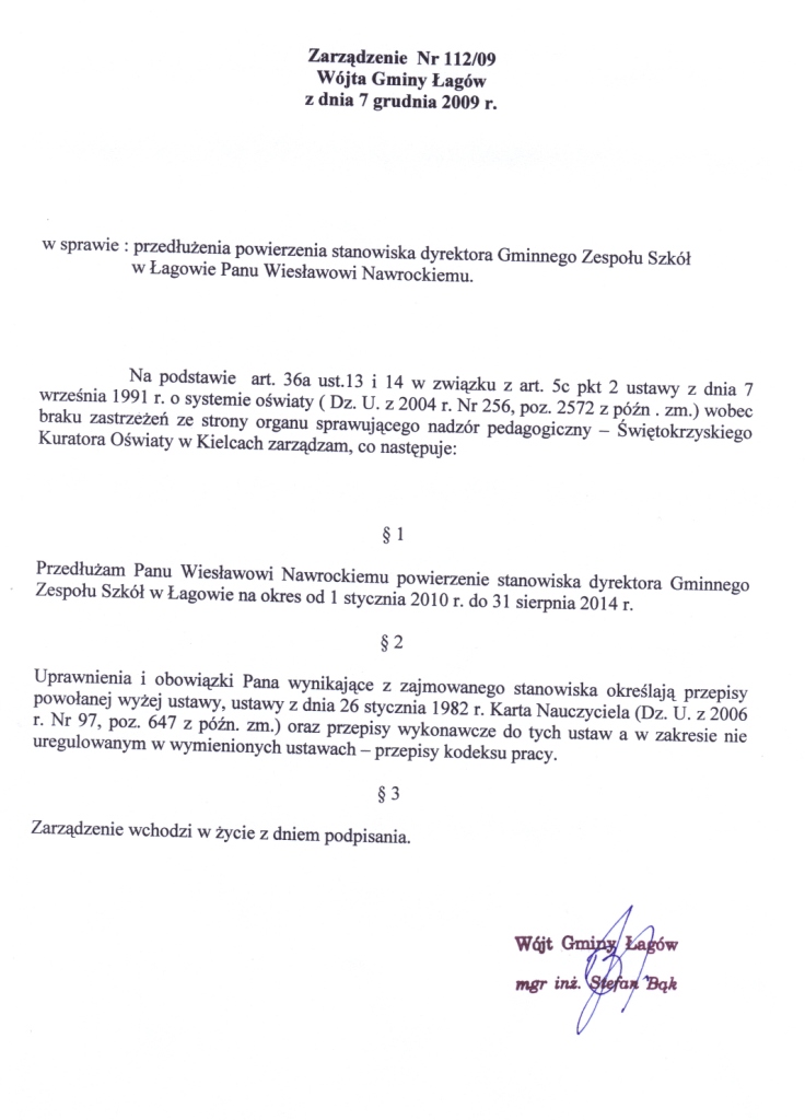 | Zarządzenie Nr 112/09 Wójta Gminy Łagów z dnia 7 grudnia 2009r. w sprawie przedłużenia powierzania stanowista dyr. GZS w Łagowie p. Wiesławowi Nawrockiemu | 2009-12-24 |