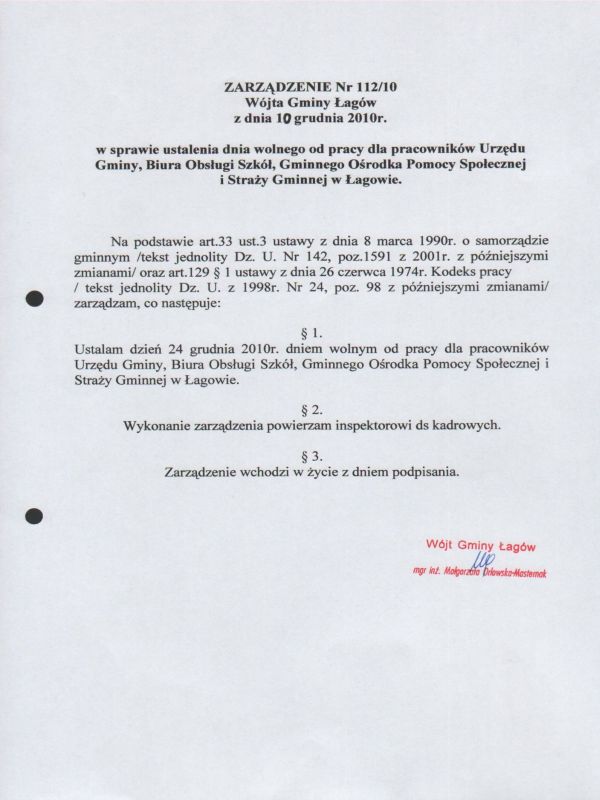 | Zarządzenie Nr 112/10 Wójta Gminy Łagów z dnia 10 grudnia 2010 r. w sprawie ustalenia dnia wolnego od pracy dla pracowników Urzędu Gminy, Biura obsługi Szkół, Gminnego Ośrodka Pomocy Społecznej i Straży Gminnej w Łagowie | 2011-01-04 |