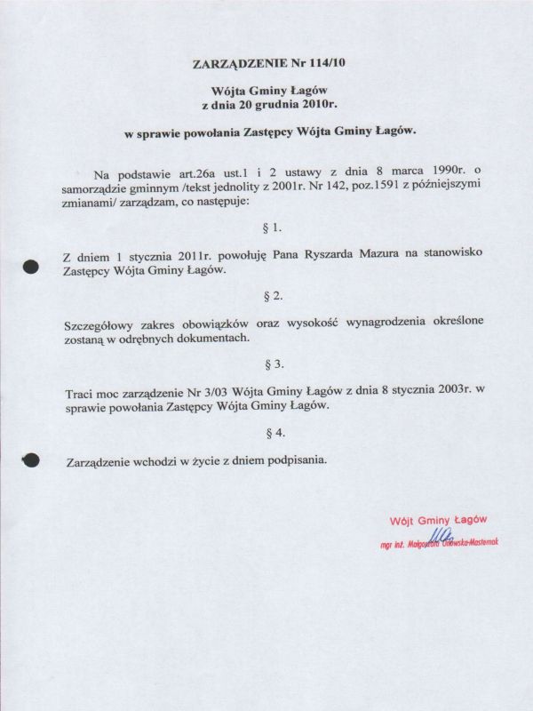 | Zarządzenie Nr 114/10 Wójta Gminy Łagów z dnia 20 grudnia 2010 r. w sprawie powołania Zastępcy Wójta Gminy Łagów | 2011-02-02 |