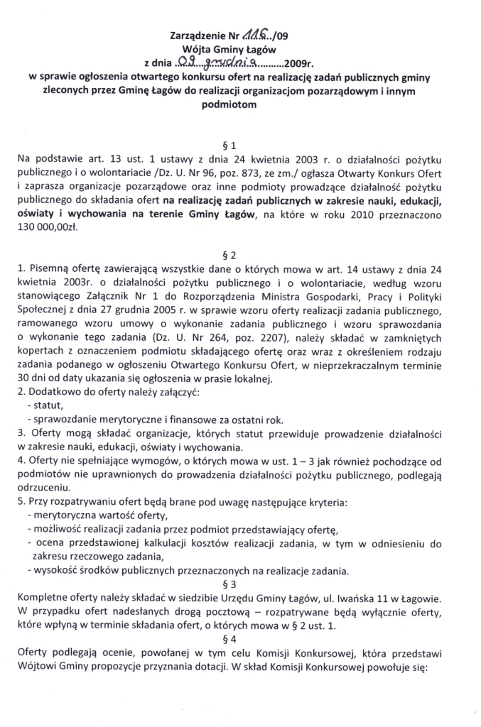 | Zarządzenie Nr 116/09 Wójta Gminy Łagów z dnia 09 grudnia 2009r. w sprawie ogłoszenia otwartego konkursu ofert | 2009-12-24 |