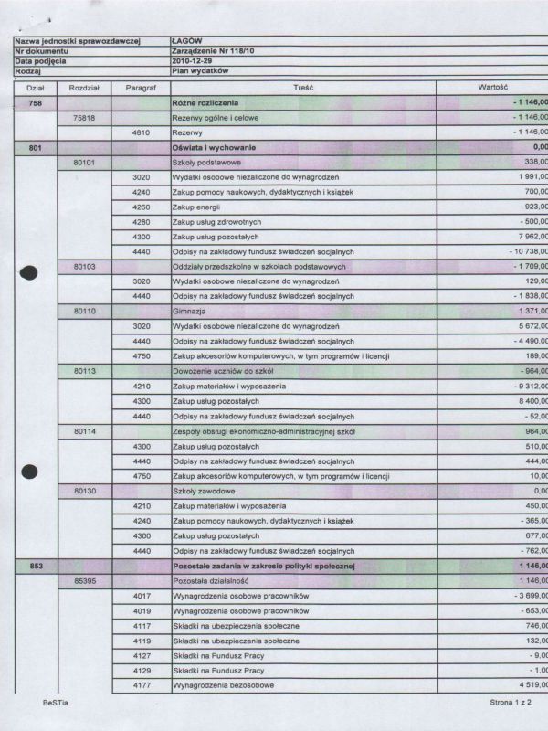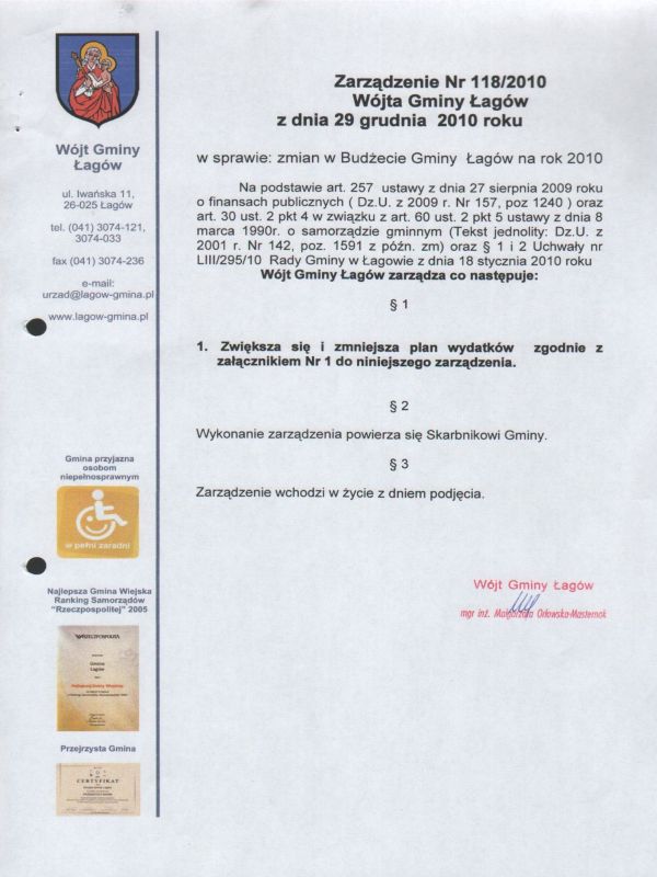 | Zarządzenie Nr 118/2010 Wójta Gminy Łagów z dnia 29 grudnia 2010 roku w sprawie : zmian w Budżecie Gminy Łagów na rok 2010 | 2011-02-02 |