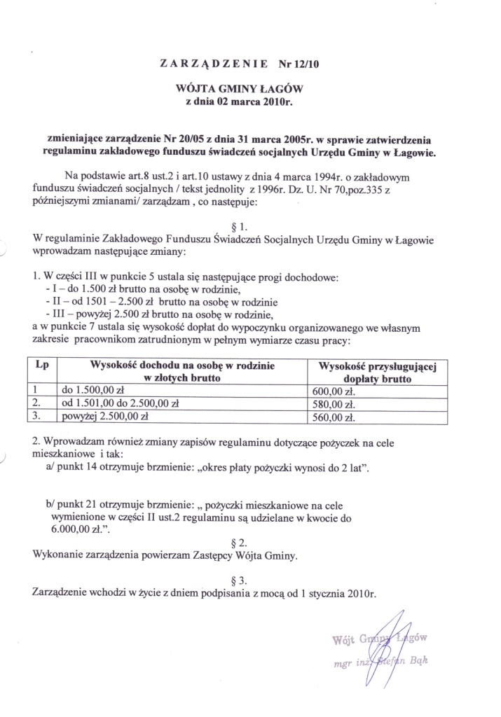| Zarządzenie Nr 12/10 Wójta Gminy Łagów z dnia 02 marca 2010 roku zmieniające zarządzenie Nr 20/05 z dnia 31 marca 2005 r. w sprawie zatwierdzenia regulaminu zakładowego funduszu świadczeń socjalnych Urzędu Gminy w Łagowie | 2010-05-14 |