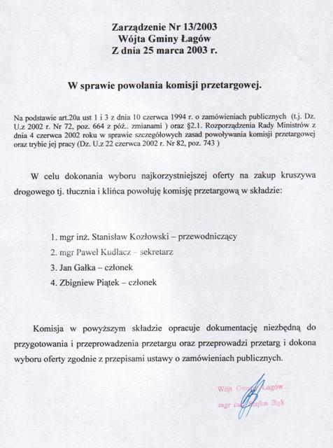 | Zarządzenie nr 13/03 Wójta Gminy Łagów z dn. 25 marca 2003 r. w sprawie powołania komisji przetargowej. | 2008-10-23 |