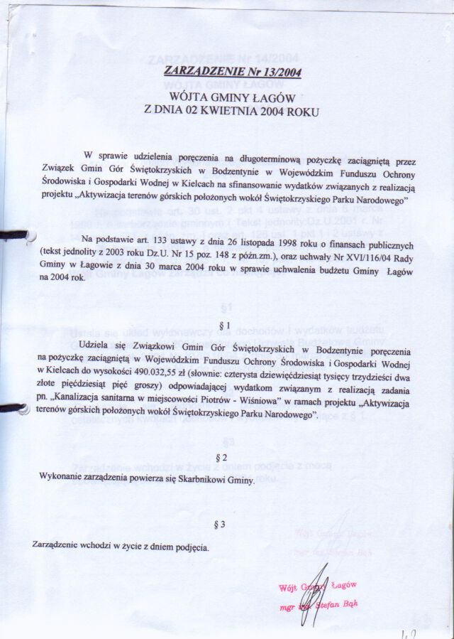 | Zarządzenie nr 13/04 Wójta Gminy Łagów z dn. 2 kwietnia 2004 r. W sprawie udzielenia poręczenia na długoterminową pożyczkę zaciągniętą przez Związek Gmin Gór świętokrzyskich w Bodzentynie. | 2008-10-22 |