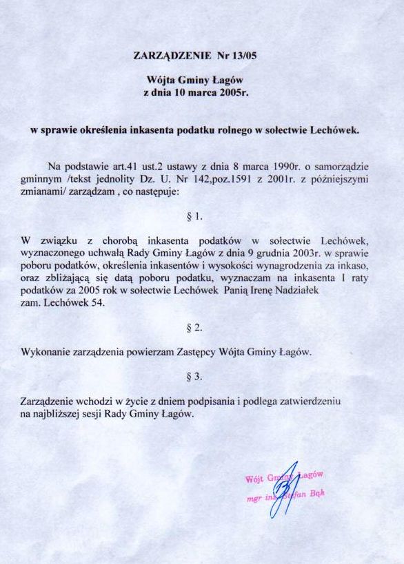 | Zarządzenie nr 13/05 Wójta Gminy Łagów z dn. 10 marca 2005 r. w sprawie określenia inkasenta podatku rolnego w sołectwie Lechówek. | 2008-10-17 |