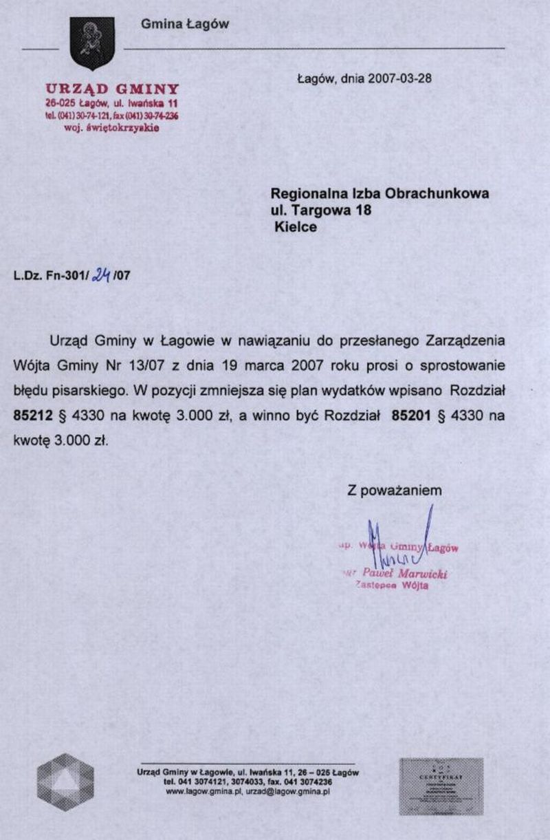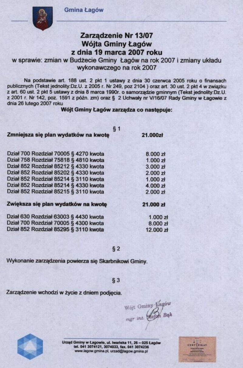 | Zarządzenie nr 13/07 Wójta Gminy Łagów z dn. 19 marca 2007 r. w sprawie zmian w Budżecie Gminy Łagów na rok 2007 i zmiany układu wykonawczego na rok 2007. | 2008-08-25 |