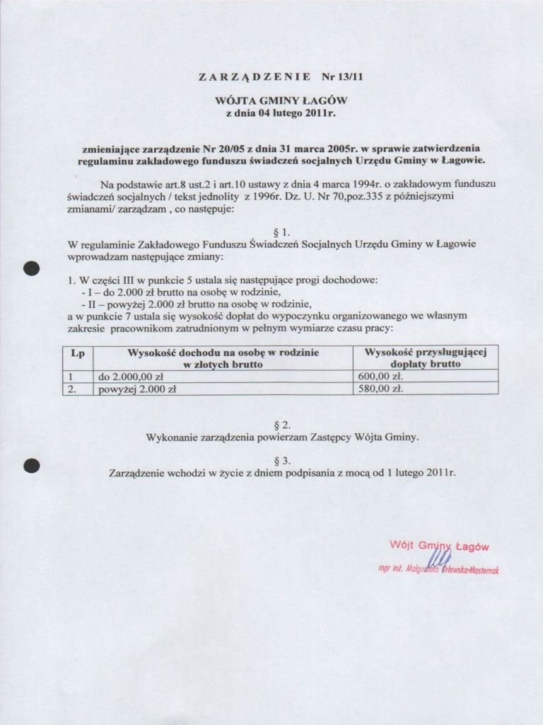 | Zarządzenie Nr 13/11 Wójta Gminy Łagów z dnia 04 lutego 2011 r. zmieniające zarządzenie Nr 20/05 z dnia 31 marca 2005 r. w sprawie zatwierdzenia regulaminu Zakładowego Funduszu świadczeń Socjalnych Urzędu Gminy w Łagowie | 2011-03-23 |