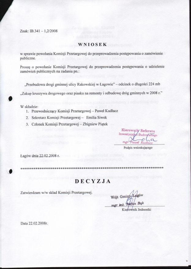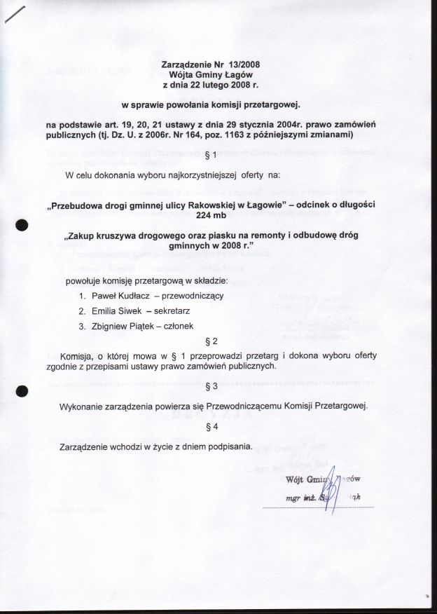 | Zarządzenie nr 13/2008 Wójta Gminy Łagów z dn. 22 lutego 2008 r. w sprawie powołania komisji przetargowej. | 2008-08-23 |