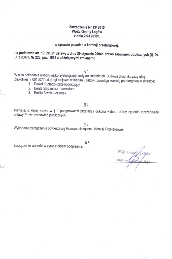 | Zarządzenie Nr 13/2010 Wójta Gminy Łagów z dnia 02.03.2010r. w sprawie powołania komisji przetargowej. | 2010-05-14 |