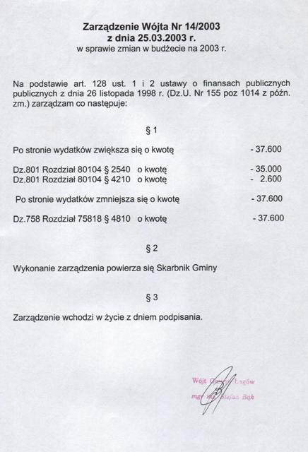 | Zarządzenie nr 14/03 Wójta Gminy Łagów z dn. 25 marca 2003 r. w sprawie zmian w budżecie na 2003 r. | 2008-10-23 |