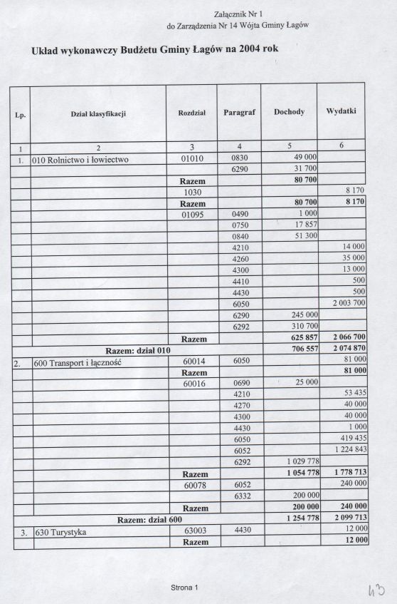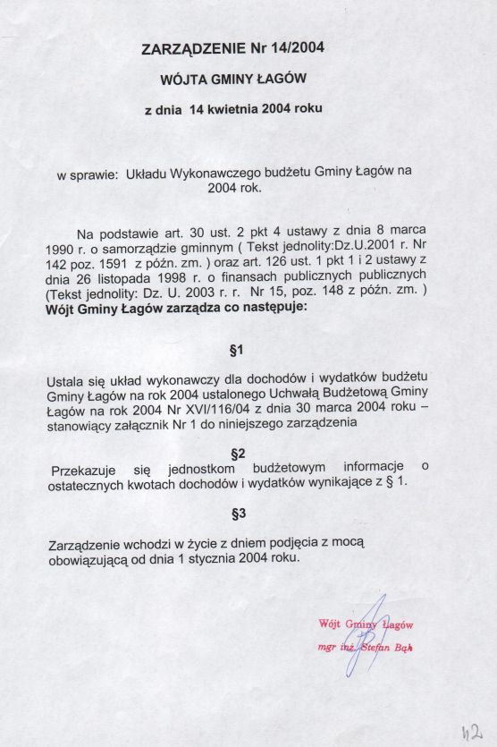 | Zarządzenie nr 14/04 Wójta Gminy Łagów z dn. 14 kwietnia 2004 r. w sprawie Układu Wykonawczego Gminy Łagów na 2004 rok. | 2008-10-22 |