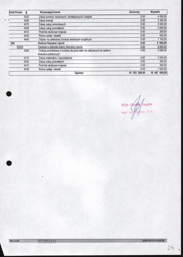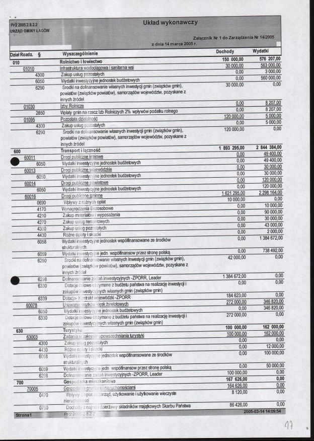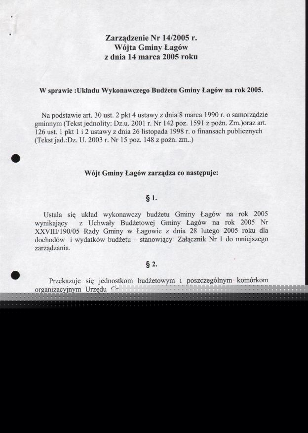 | Zarządzenie nr 14/05 Wójta Gminy Łagów z dn. 14 marca 2005 r. w sprawie :Układu Wykonawczego Budżetu Gminy Łagów na rok 2005. | 2008-10-17 |