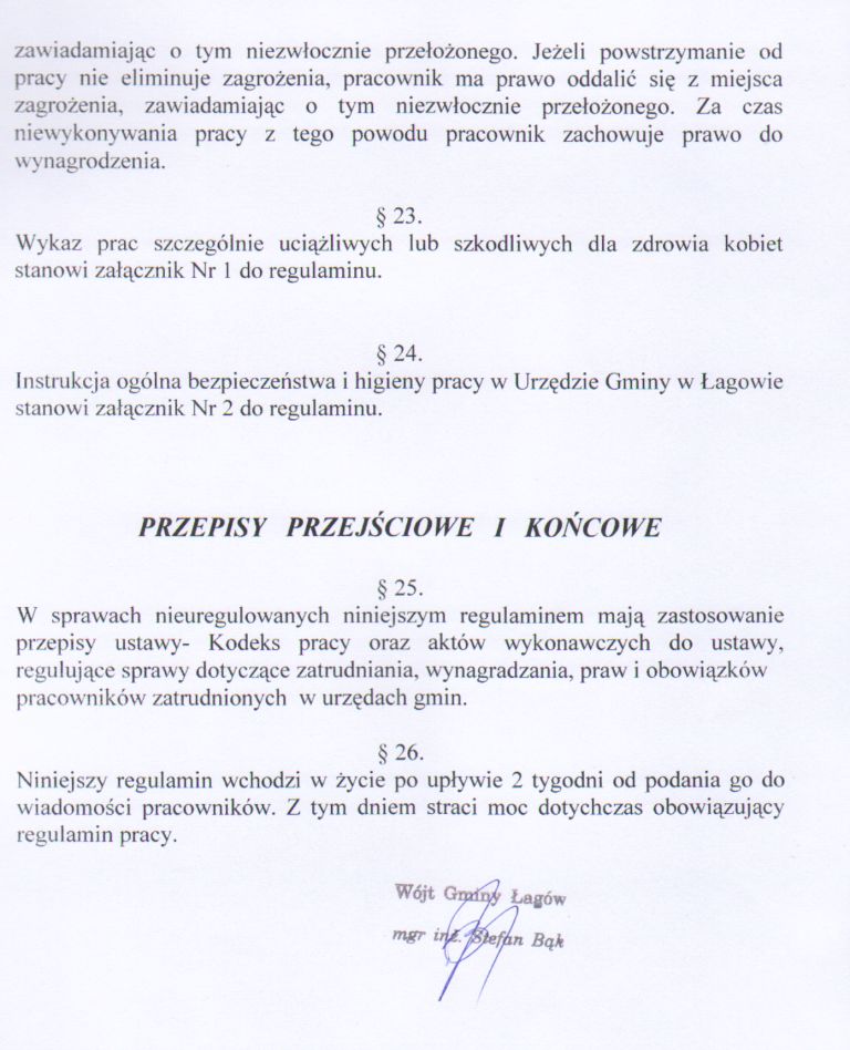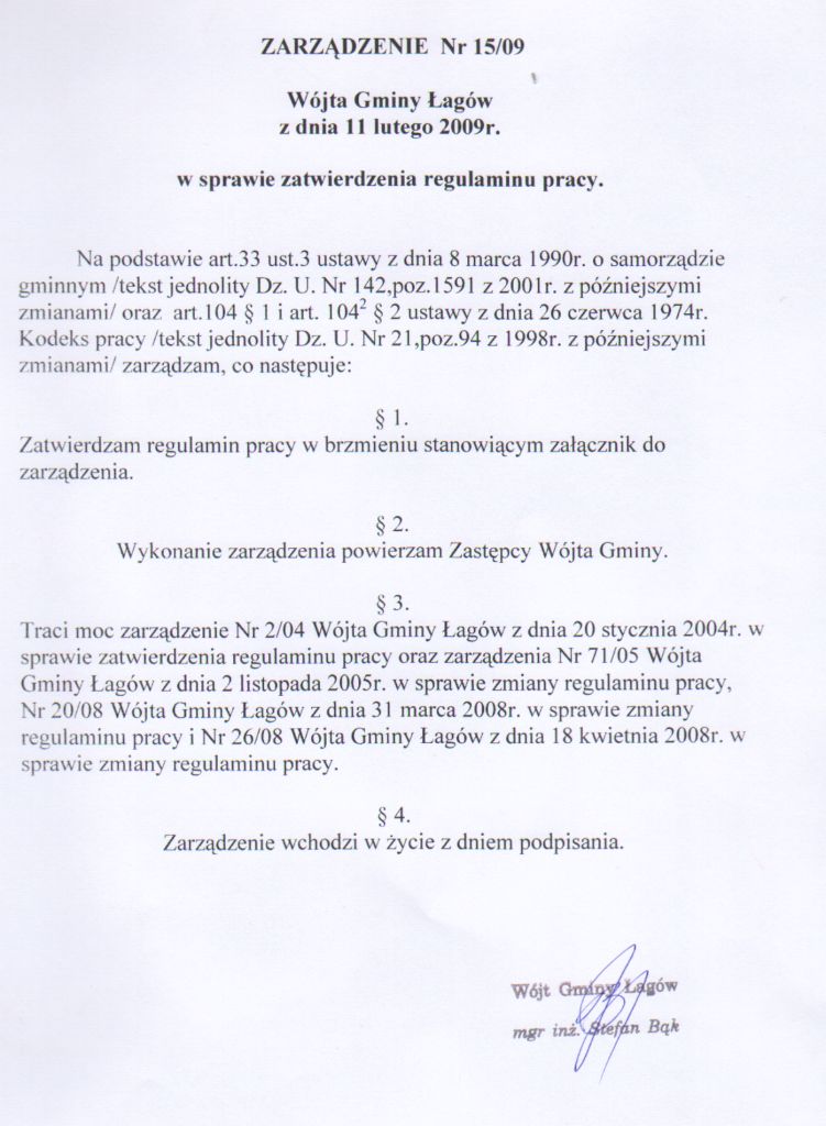 | Zarządzenie nr 15/09 Wójta Gminy Łagów z dnia 11 lutego 2009 r. w sprawie zatwierdzenia regulaminu pracy | 2009-06-10 |
