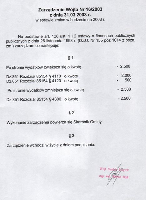 | Zarządzenie nr 16/03 Wójta Gminy Łagów z dn. 31 marca 2003 r. w sprawie zmian w budżecie na 2003 r. | 2008-10-23 |