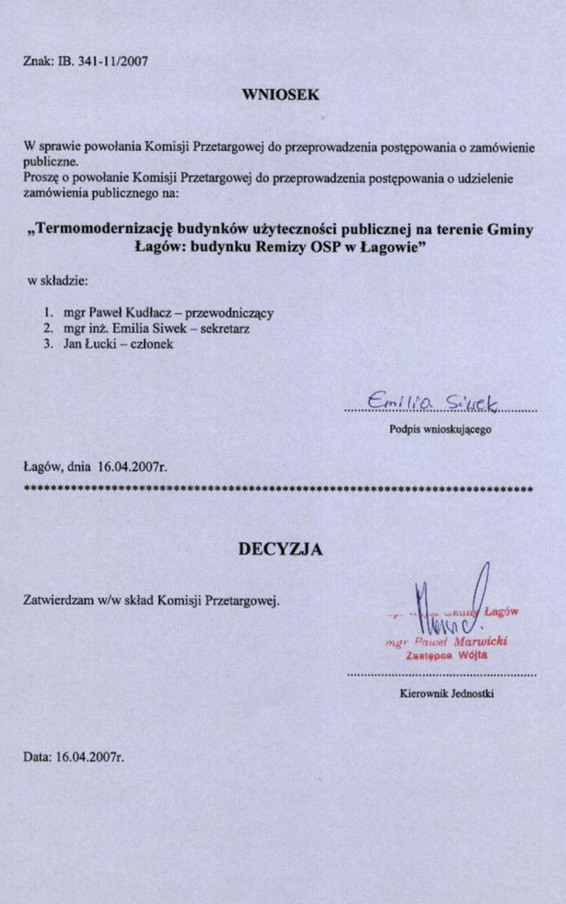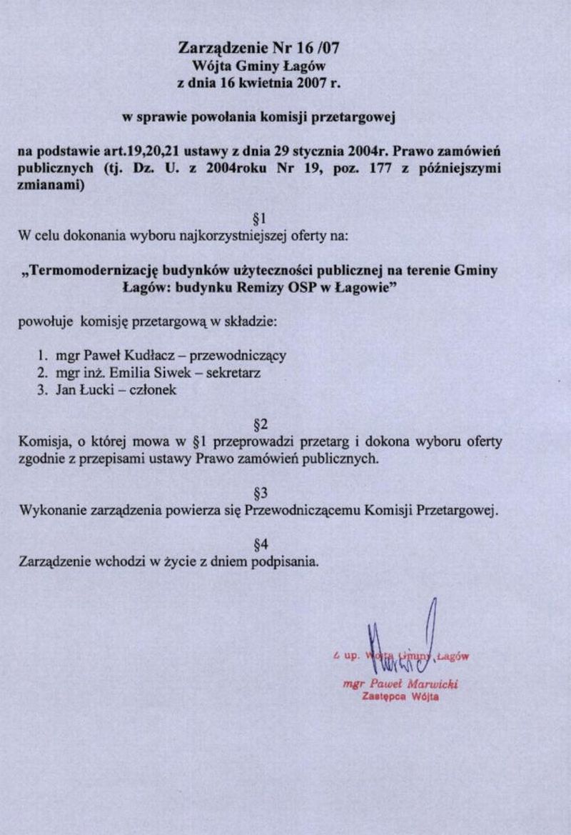 | Zarządzenie nr 16/07 Wójta Gminy Łagów z dn. 16 kwietnia 2007 r. w sprawie powołania komisji przetargowej. | 2008-08-25 |