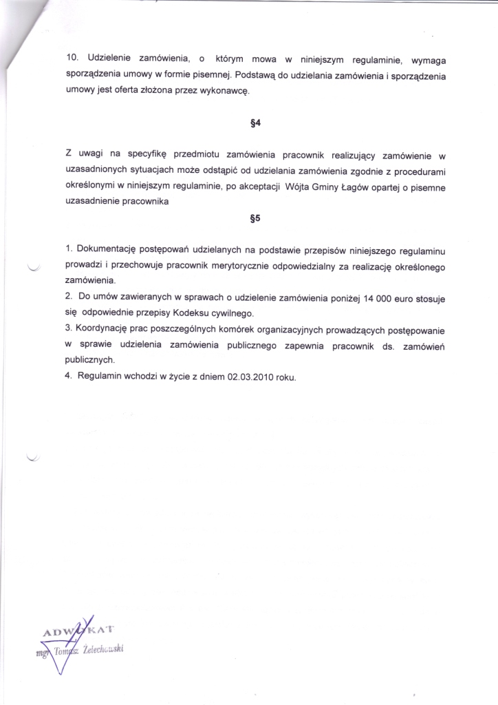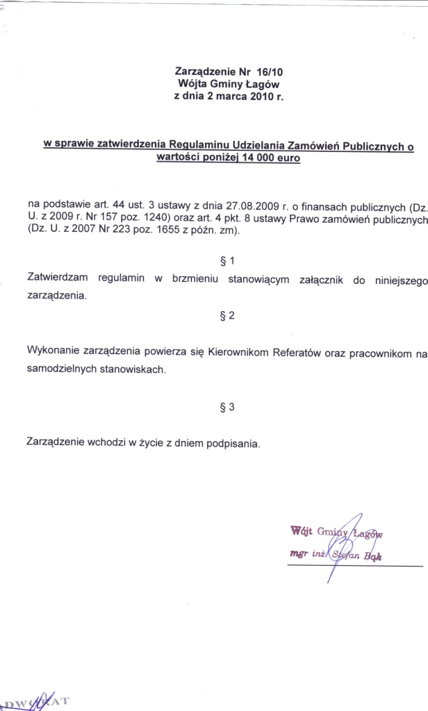 | Zarządzenie Nr 16/10 Wójt Gminy Łagów z dnia 2 marca 2010r. w sprawie zatwierdzenia Regulaminu Udzielania Zamówień Publicznych o wartości poniżej 14 000 euro | 2010-05-14 |