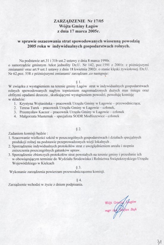 | Zarządzenie nr 17/05 Wójta Gminy Łagów z dn. 17 marca 2005 r. w sprawie oszacowania strat spowodowanych wiosenną powodzią 2005 roku w indywidualnych gospodarstwach rolnych. | 2008-10-17 |