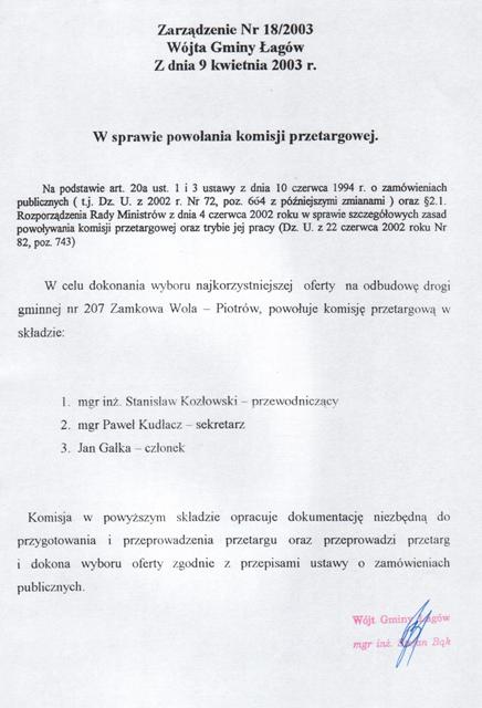 | Zarządzenie nr 18/03 Wójta Gminy Łagów z dn. 9 kwietnia 2003 r. w sprawie powołania komisji przetargowej. | 2008-10-23 |