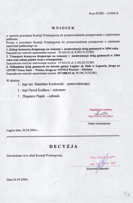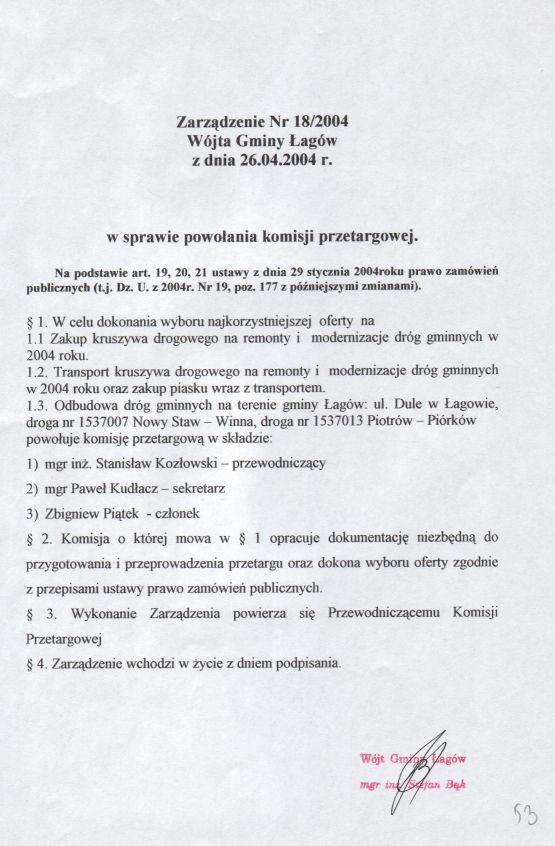 | Zarządzenie nr 18/04 Wójta Gminy Łagów z dn. 24 kwietnia 2004 r. w sprawie powołania komisji przetargowej. | 2008-10-22 |